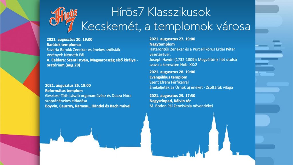 A Hírös Hét Fesztivál a régió legnívósabb rendezvénye, gyökerei egészen 1934-ig visszanyúlnak. A fesztivál szervezői kiemelten fontosnak tartják, hogy a nagymúltú programsorozatban a modern szellemiség és a kultúra, a helyi hagyományok kéz a kézben járjanak. Idén épp ezért a Hírös Hét keretei között útjára indul a Kecskemét, a templomok városa koncertsorozat is, mely igazi szakrális csemegének ígérkezik a klasszikus zene szerelmeseinek.